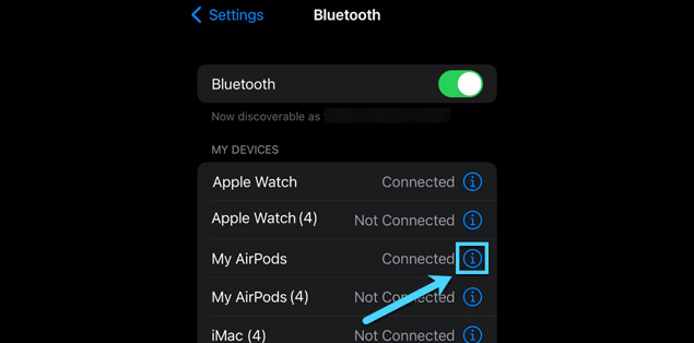 - Select Bluetooth and under “My Devices” tap on the info icon beside the name of your AirPods.